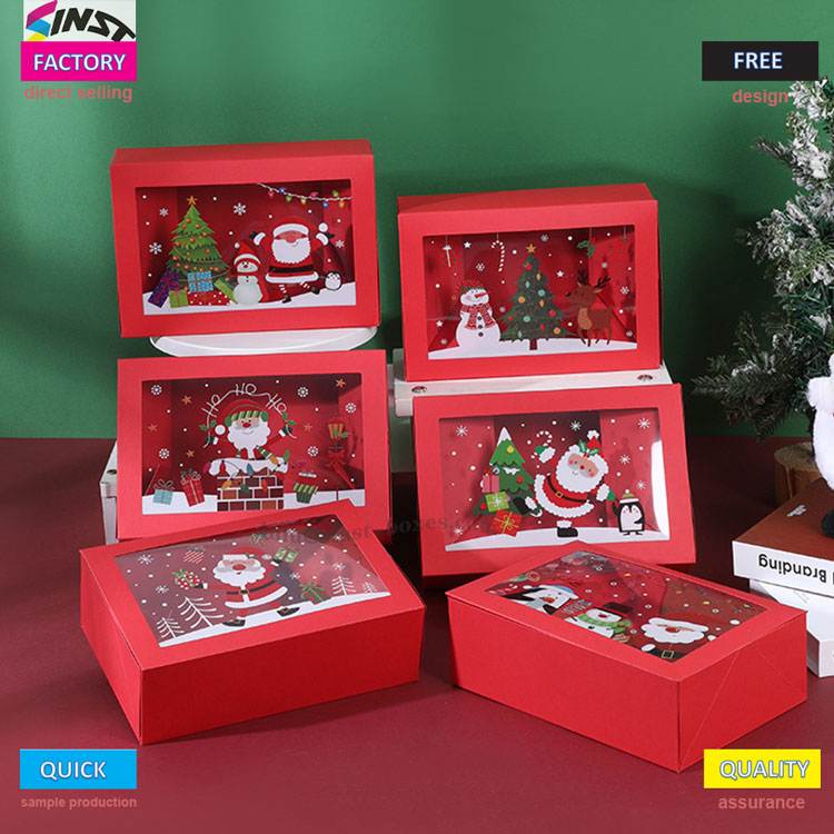 Denne juleslikæske har en varm rød baggrund, en rektangulær æske og et gennemsigtigt vindue, som et vindue for at få et glimt af et vintereventyr. Denne juleslikæske lavet af hårdt papirmateriale, som kan vise bolserne indeni og har en vis grad af stabilitet. Den kan tilpasses til daglige ting såsom chokolade, desserter, småkager, gummier osv.; Det er ikke kun en sød beholder til slik, men også en desktop juledekoration. At give det til folk til personlig brug kan lyse op i feriestemningen, så hver sødme bliver pakket ind i en følelse af ceremoni.