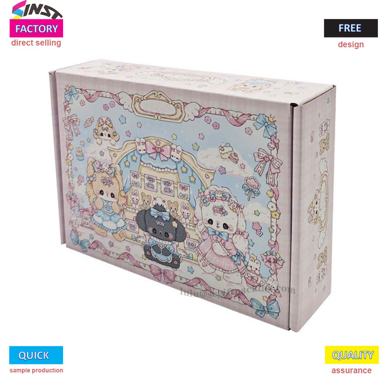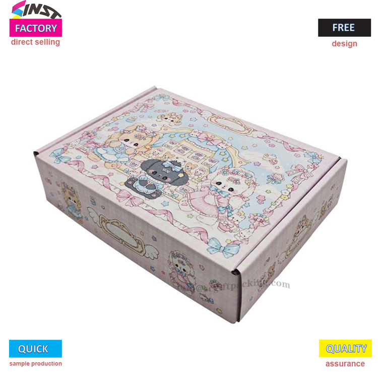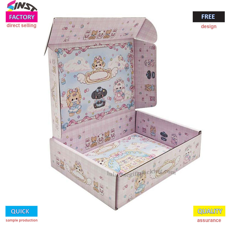 Den farverige bølgepapir flyveboks til tøj har et sødt lyserødt farveskema med lyseblå accenter. Kassen er fyldt med tegneserieelementer som blomstergarland, små dyr, buer, skyer og hjerter, hvilket skaber en drømmende og sød stil. Fra udseende til service giver det fuldt ud tøjemballage og forbedrer brand -appel.