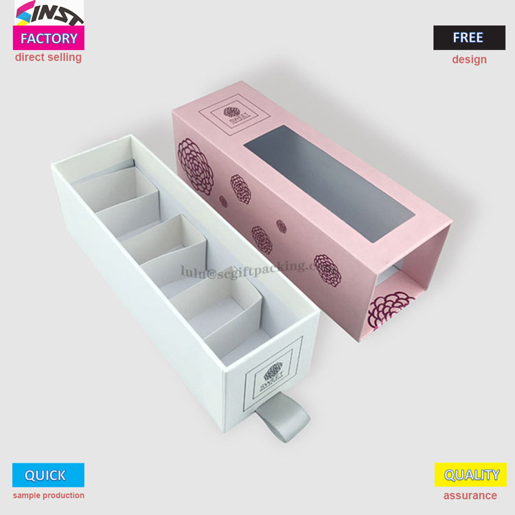Den luksusstive skuffe, der glidende gaveæskeemballage til æterisk olie, er designet som en to -farvet gaveæske, der indeholder en kollision af lyserøde og sorte farver for at skabe en enkel og luksuriøs fornemmelse - den lyserøde boks er pyntet med dybe lilla blomster/lilla mønstre og leveres med et gennemsigtigt vindue for en direkte visning af indholdet; Den indre foring har en hvid skillelinje og et træk -fane -design, der giver mulighed for let ekstraktion med bare et blidt træk. Fem separate rum er tilgængelige til opbevaring af smykker, skønhedsprøver eller 30 ml propolisflasker, hvilket sikrer et rent og bekymringsfrit miljø. Kan bruges som en neglelak klæbende gaveæske, læbestift gaveæske, prøve gaveæske osv.;