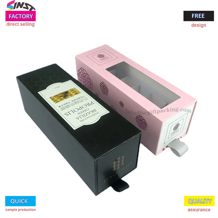 Denne luksusstive skuffe glidende gaveæskeemballage til æterisk olie har et rumindrettet design og gennemsigtige vinduer, der giver mulighed for klar synlighed af de fire rum inde i boksen uden behov for at åbne låget; Når de sorte og lyserøde dobbeltbokse er placeret side om side, kan designens opfindsomhed ses: den sorte kasse har guldbogstaver pyntet på kroppen for et mere struktureret look, og den sorte trækring på siden kan let trækkes op; Den lyserøde model bevarer et gennemsigtigt vindue, som direkte kan se den specielle tank til essensprøve - lotionstøvning, 10 ml essens indpakket tæt. Fra essensprøver til værktøjer er divisionen klar og ikke blandet.