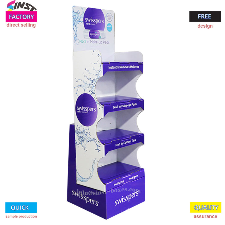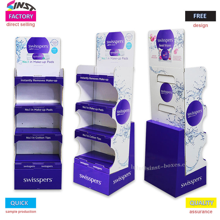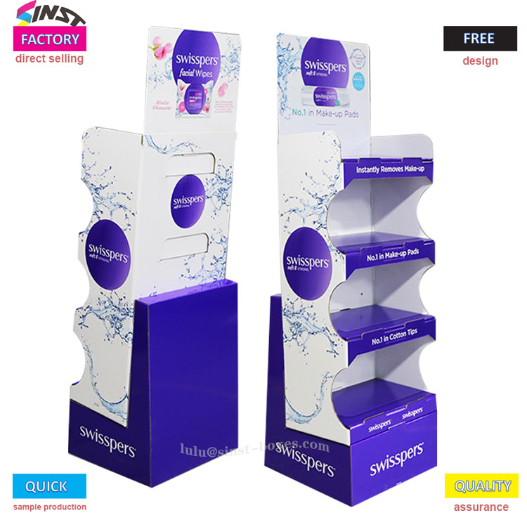 Displaystativet til vådservietter er designet med flere lag, hver med riller til sikkert at holde små genstande såsom vådservietter og vatpinde, hvilket gør det let at få adgang til. Materialet er pap, som er let og nemt at arrangere, og det er også praktisk at genopfylde. Det hører til den type displayværktøj, der ser simpelt ud og står fast, når det bruges.